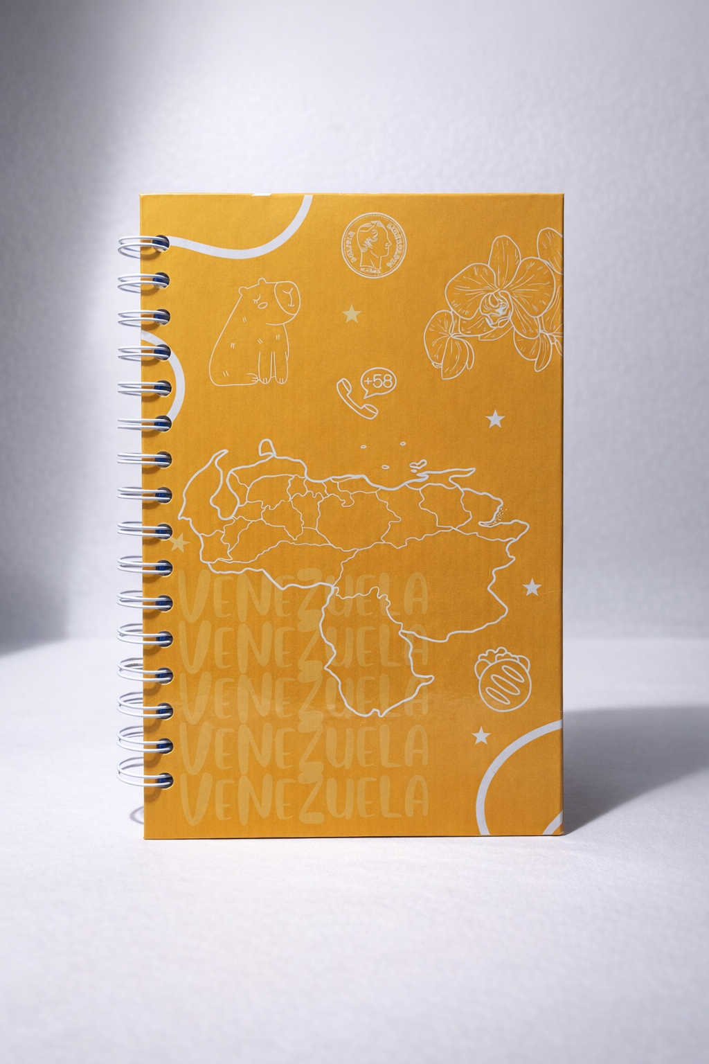 Esta libreta celebra lo nuestro: una portada vibrante con ilustraciones que evocan la riqueza natural y cultural de Venezuela —desde el mapa hasta la orquídea, el chiguire, el código +58 y otros símbolos que nos conectan con lo cotidiano y lo esencial.